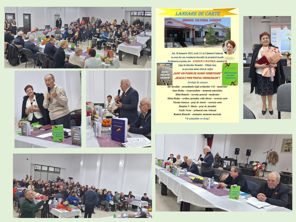 30 ianuarie 2025. Primăria Comunei Ivănești, județul Vaslui, a organizat o manifestare cultural-artistică de înaltă ținută: Lansare de carte, autor Angelica Manole, originară de pe aceste meleaguri. Angelica, autoare de mai multe volume de poezie, proză, povești, și-a luat seva din rădăcinile pământului natal și acum s-a întors acasă, într-o zi de sărbătoare, „Sfinții Trei Ierarhi”, pentru a dărui din creațiile sale volumele „Desculț prin praful vremurilor” și „Sunt un pumn de humă vorbitoare”. Autoarea a dezvăluit că a avut două visuri mari: să prezinte volumul „Aripi de credință”, la Biserica din Coșești, acolo unde a văzut lumina zilei și lansarea celor două volume menționate la Căminul Cultural Ivănești, centrul culturii pentru cele 17 sate componente. Primul vis s-a realizat tot la o mare sărbătoare, de Sfânta Bobotează, iar astăzi s-a împlinit cel de-al doilea vis. Fiica acestei comune s-a întors acasă, dar nu singură. A avut ca invitați nu numai fii ai satului ci și foști colegi de școală și de serviciu, foști elevi, prieteni, rude, săteni, preoți și călugări, ziariști, scriitori din Vaslui și Iași, membri ai Ligii Scriitorilor Români – Filiala Iași. Sala a devenit neîncăpătoare. Cunoscutul fiu al satului, Prof. univ. dr. Ionel Miron și Membru al Academiei Oamenilor de Știință, a revenit și dânsul pe locurile natale și a spus: „am avut norocul ca pe aceste meleaguri să mă bucur de cea mai fericită copilărie pe care și-o putea imagina un copil”, apoi a vorbit cu mare drag despre scriitoare: „Tot ce este în carte este inimă vie”.