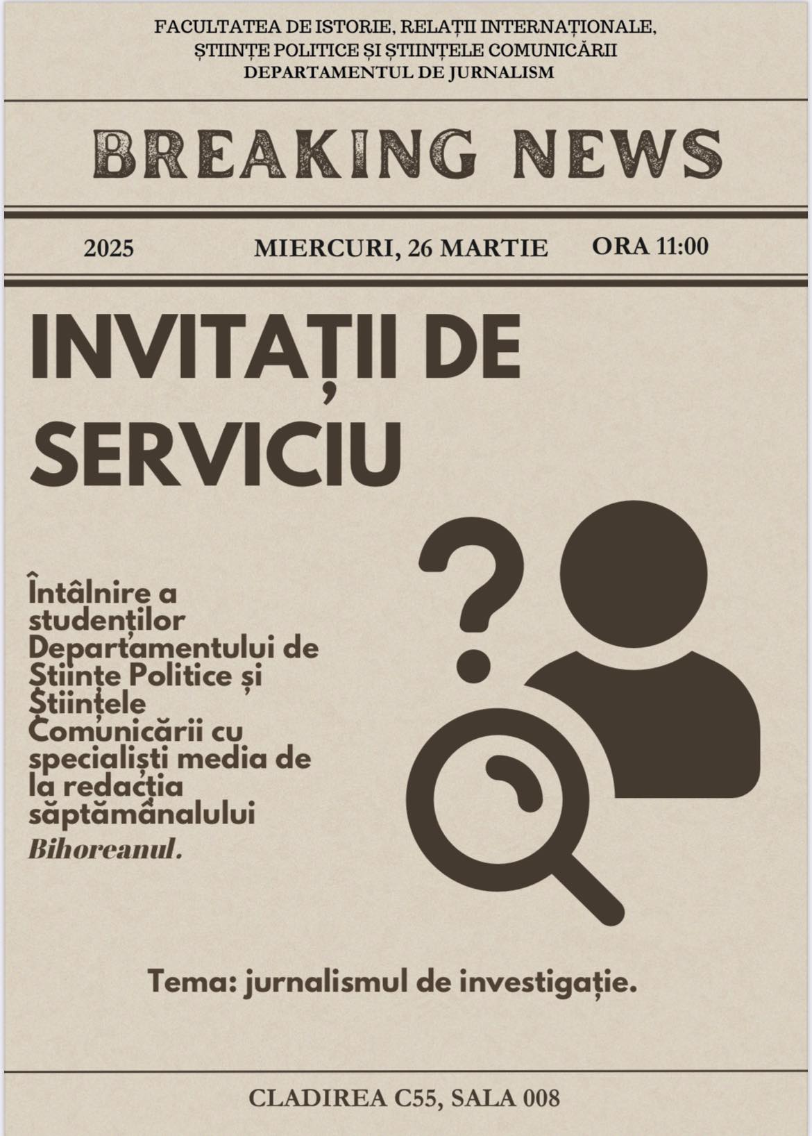 Prima întâlnire îi va avea invitați pe ziariștii săptămânalului Bihoreanul, pe tema “Jurnalismului de investigație” și se va desfășura miercuri, 26 martie de la ora 11, la sediul Departamentului, clădirea C55, sala 008.