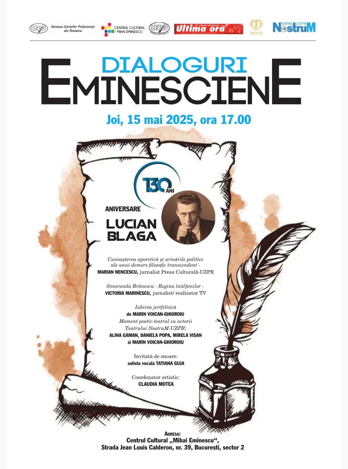 Joi 15 mai 2025, ora 17.00, la Centrul Cultural „Mihai Eminescu”, din București (strada J. L. Calderon, nr. 39) va avea loc cea de a 4-a ediție a DIALOGURILOR EMINESCIENE, o manifestare cultural-artistică, marca Uniunea Ziariștilor Profesioniști din România. Programul cuprinde comunicările: Aniversare Lucian Blaga – 130. Cunoașterea aporetică și urmările politice ale unui demers filosofic transcendent cu Marian Nencescu, jurnalist Presa Culturală-UZPR și respectiv Smaranda Brănescu – Regina înălțimilor cu Victoria Marinescu, jurnalist/ realizator TV. Programul va continua cu momentul poetic- teatral, Iubirea jertfelnică de Marin Voican-Ghioroiu care va fii interpretată de actorii Teatrului NostruM-UZPR: Alina Găman, Doina Ghițescu, Daniela Popa, Mirela Vișan și Marin Voican – Ghioroiu. Invitată de onoare: solista vocală Tatiana Guja. Coordonator artistic: Claudia Motea.
