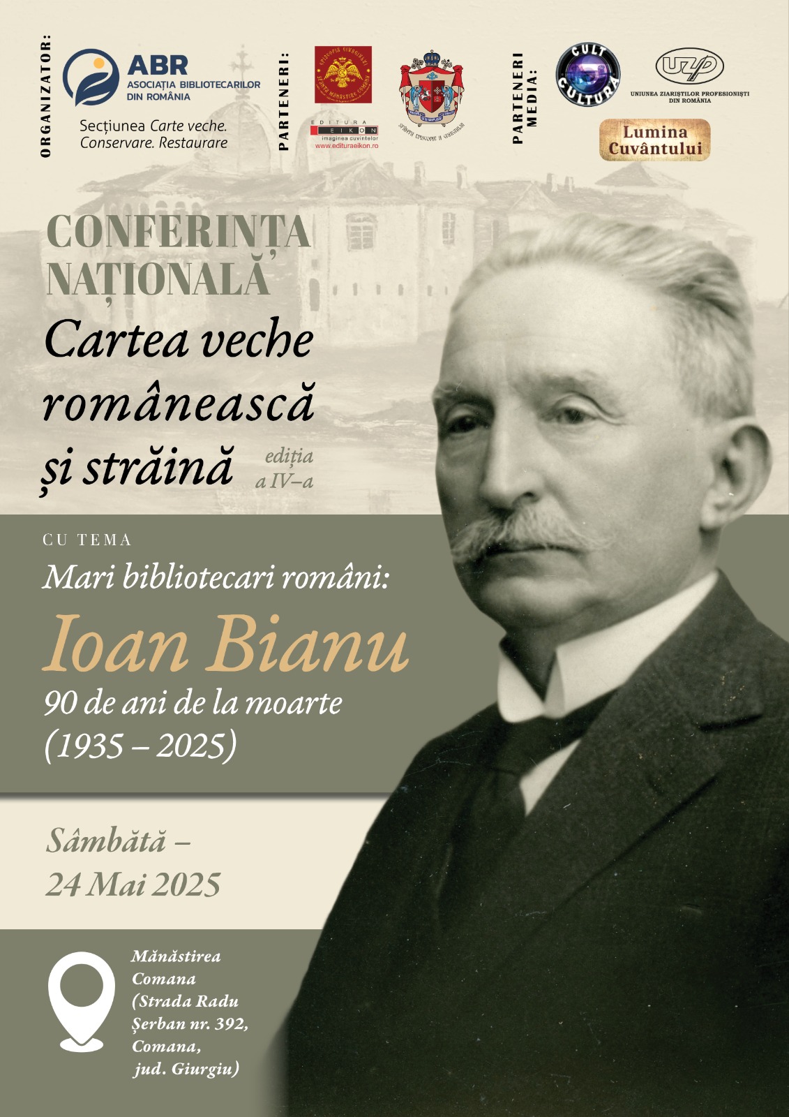 Secțiunea Carte veche. Conservare. Restaurare din cadrul Asociației Bibliotecarilor din România (ABR), în parteneriat cu Mănăstirea Comana (jud. Giurgiu), Episcopia Giurgiului și Editura Eikon, organizează ediția a IV-a a Conferinței Naționale Cartea veche românească și străină, cu tema „Mari bibliotecari români: Ioan Bianu. 90 de ani de la moarte (1935 – 2025)”.