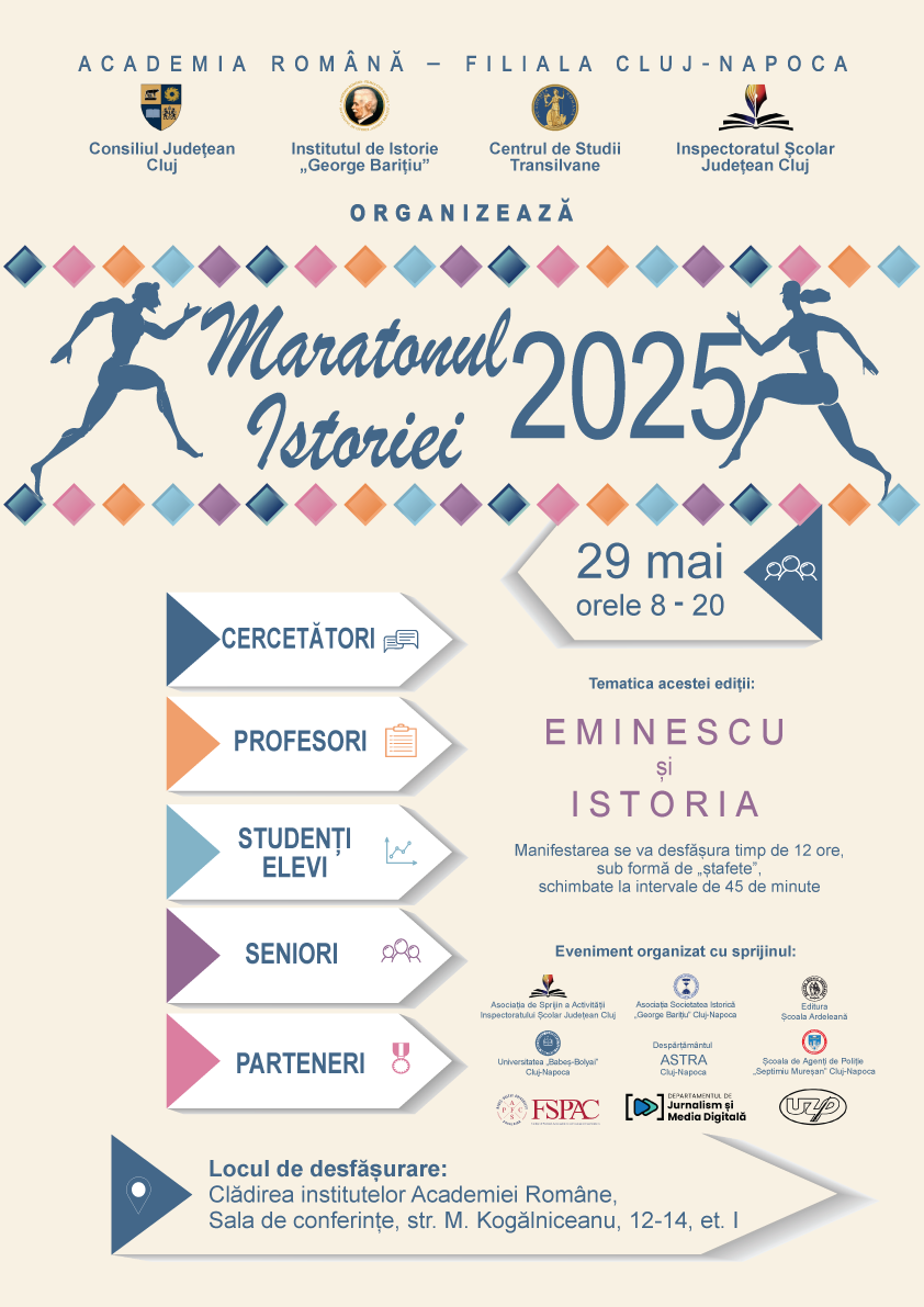 Institutul de Istorie „George Barițiu” al Academiei Române din Cluj-Napoca și Centrul de Studii Transilvane, în parteneriat cu Inspectoratul Școlar Județean Cluj și Consiliul Județean Cluj organizează joi, 29 mai 2025, cea de-a patra ediție a Maratonului Istoriei, manifestare prilejuită de Anul Cultural Mihai Eminescu, care va aduce împreună cercetători științifici, elevi, studenți și seniori.