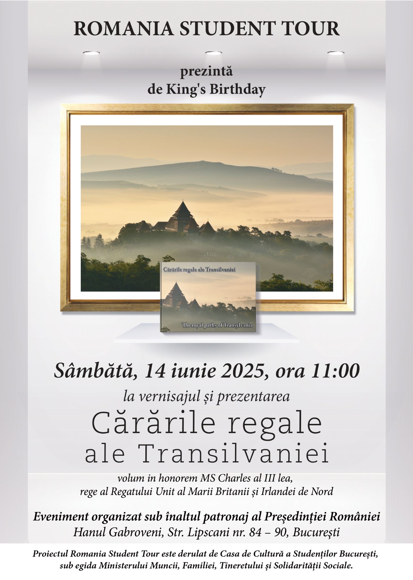 În semn de prețuire a dragostei și atașamentului față de România a Majestății Sale Charles al III lea, Rege al Marii Britanii și Irlandei de Nord, echipa România Student Tour a dat curs unei noi provocări de a realiza volumul in honorem Cărările Regale ale Transilvaniei, o incursiune iconică, spațială și temporală, urmând traseul vizitelor Majestății Sale în Transilvania.