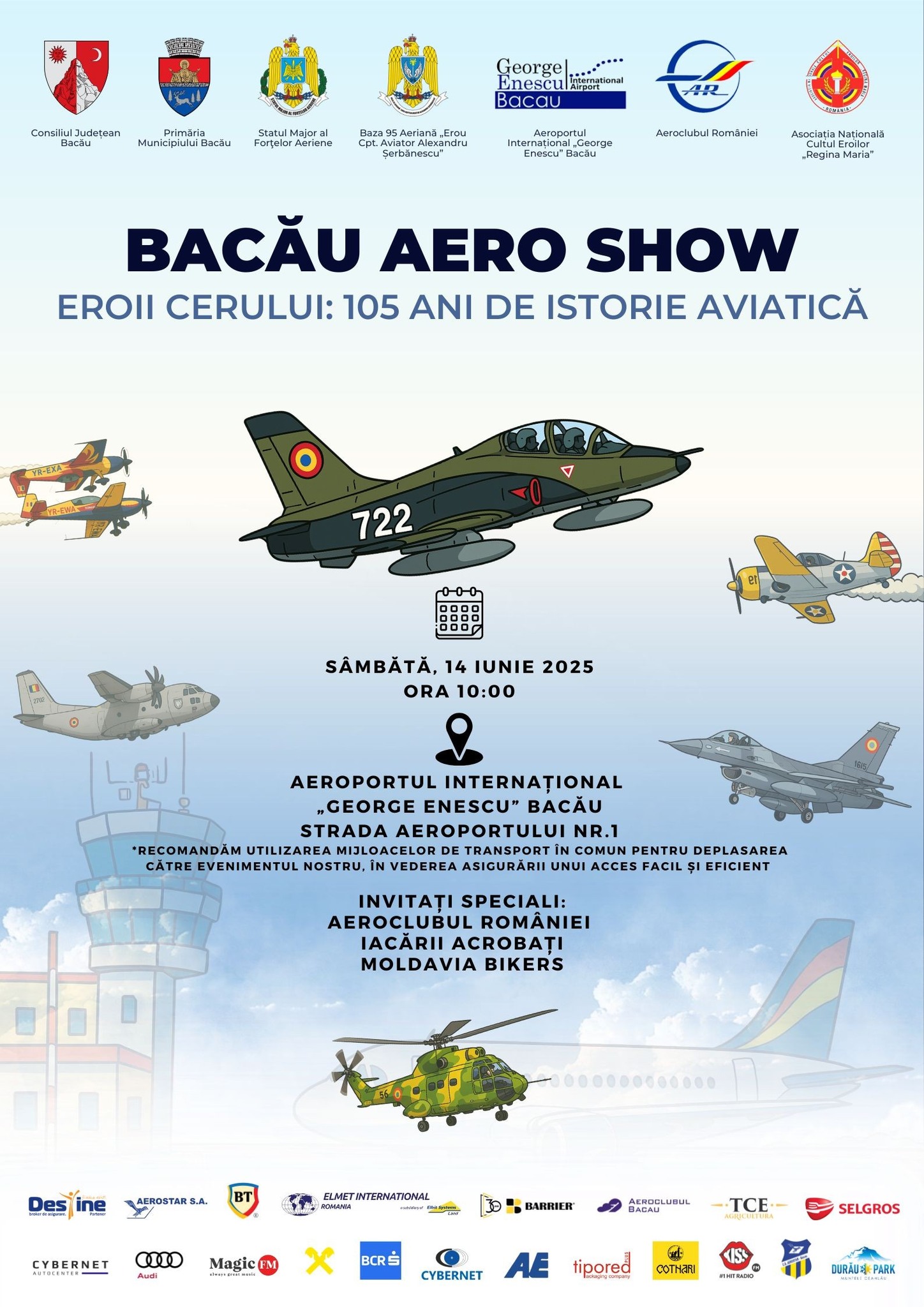 Avioane de luptă, parașutiști și muzică militară se pot urmări,sâmbătă, 14 iunie, începând cu ora 09:30, pe Aeroportul Internațional ,,George Enescu” din Bacău. Spectacolul aviatc BACĂU AERO SHOW este organizat de Baza 95 Aeriană ,,Erou căpitan aviator Alexandru Șerbănescu” cu prilejul împlinirii a 105 ani de existență în slujba aripilor românești .