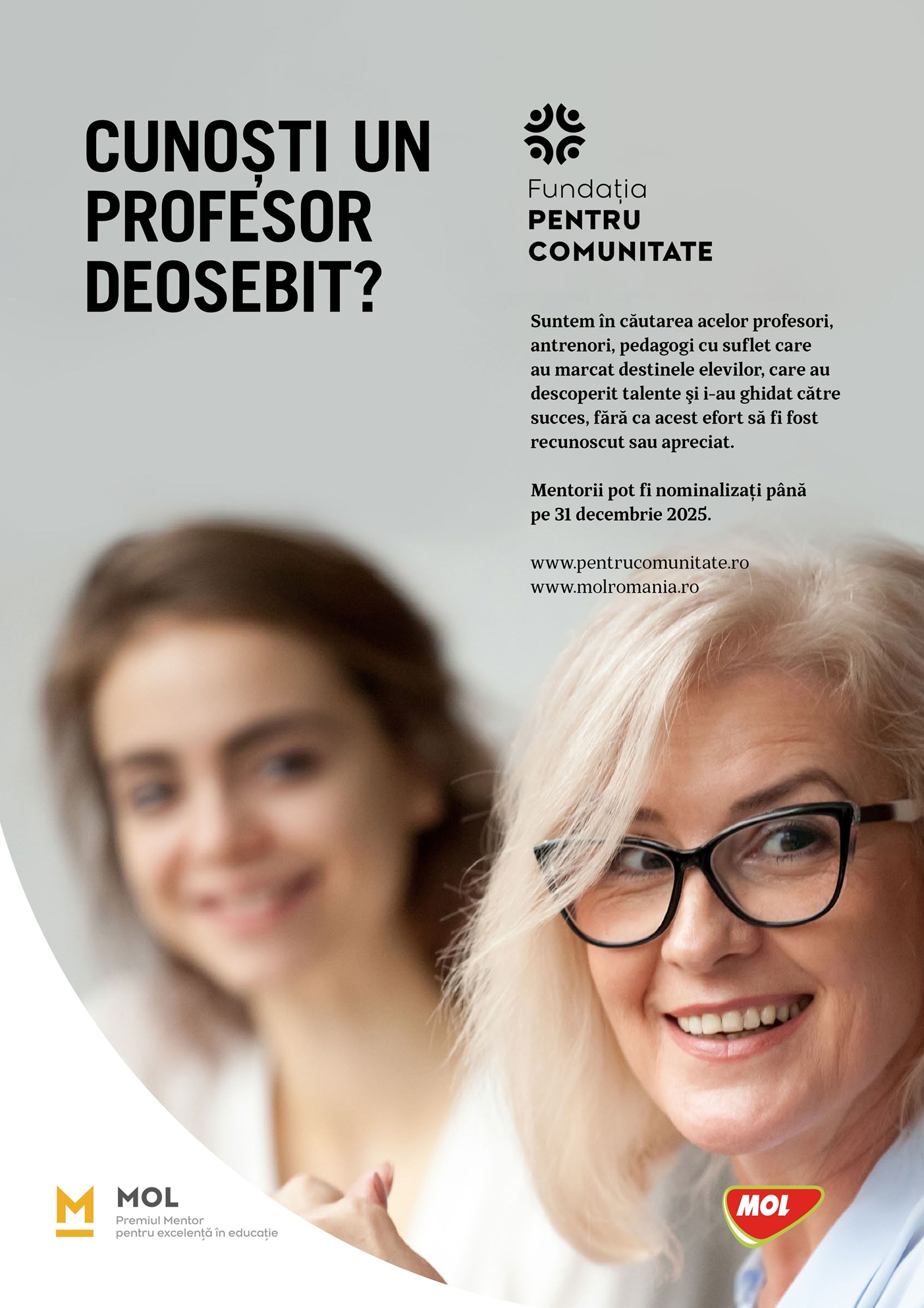 Cluj-Napoca, 13 iunie 2025 – MOL România și Fundația Pentru Comunitate au acordat, pentru al 15-lea an consecutiv, Premiile Mentor pentru excelență în educație, acordate în semn de recunoștință profesorilor pentru valoarea adăugată în societate și pentru rezultatele activității didactice. Au fost laureați zece profesori și antrenori de excepție din toată țara, care au descoperit și susținut tineri talentați și care au avut un rol important în viața elevilor lor. Laureații au fost premiați cu câte un trofeu realizat de renumitul artist sticlar Ioan Nemțoi și cu câte un premiu în valoare de 10.000 de lei. Nominalizările la acest premiu au fost depuse în perioada iunie – decembrie 2024 de elevi, părinți sau de colegii mentorilor.