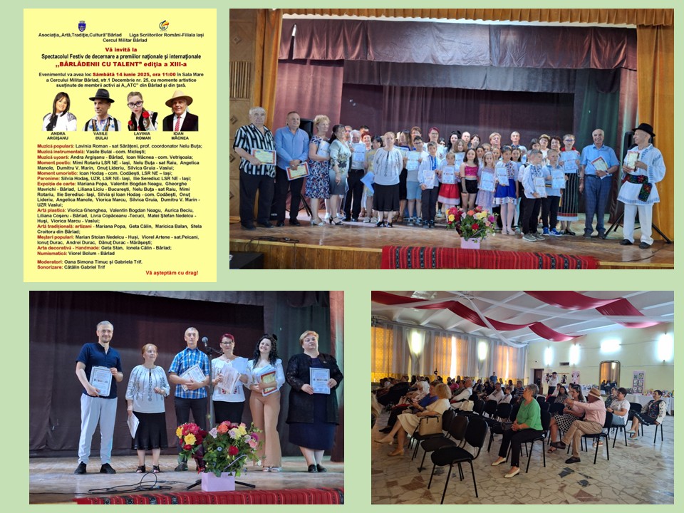 Pe 14 iunie 2025, orașul Bârlad a devenit cunoscut, nu numai prin faptul că a dat doi șefi de stat, Al. I. Cuza și pe Gheorghiu Dej sau prin existența unuia din cele mai mari și mai bine dotate Observatoare Astronomice din țară, ci și prin activitatea culturală care a avut loc. Spectacolul Festiv de Decernare a premiilor naționale şi internaționale ,,BÂRLĂDENII CU TALENT”, ediția a XIII-a, s-a desfășurat în Sala de festivități a Cercului Militar, unde s-au adunat oameni de peste tot, din țară.
