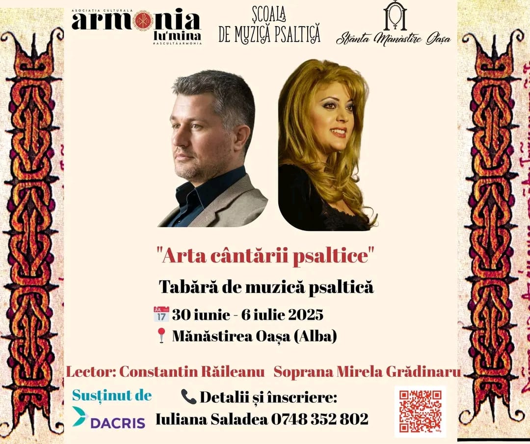 În perioada 30 iunie – 6 iulie 2025, în liniștea și frumusețea duhovnicească a Mănăstirii Oașa (județul Alba), va avea loc tabăra „Arta Cântării Psaltice”, un curs intensiv dedicat formării vocale și spirituale prin muzică bizantină și canto clasic.