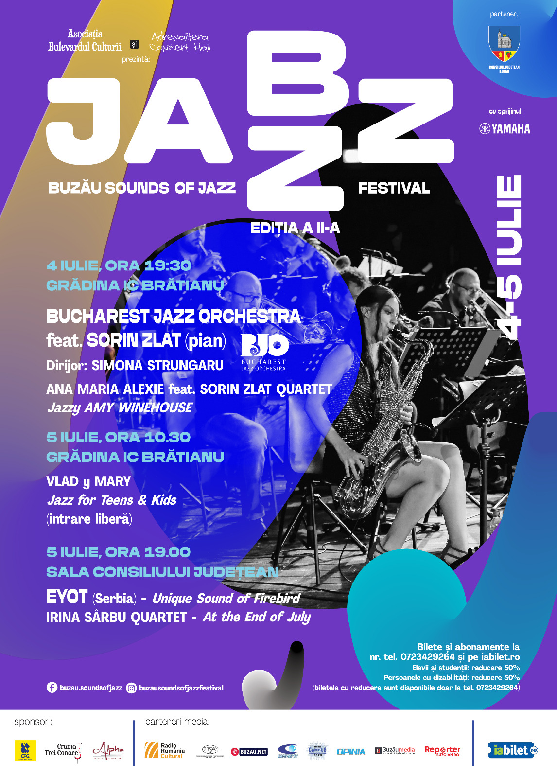 Ediția a doua a Buzău Sounds of Jazz Festival păstrează formatul care a fost atât de apreciat de audiență, așa că seara de 4 iulie se desfășoară în aer liber, într-o atmosferă relaxată, în Grădina IC Brătianu, de la orele 19.30. Într-o dublă premieră-eveniment, BUCHAREST JAZZ ORCHESTRA, sub bagheta extraordinarei dirijoare Simona Strungaru și alături de jazzistul Sorin Zlat, la pian, precum și ANA MARIA ALEXIE feat. Sorin Zlat Quartet vor cânta la Buzău. Concertul Bucharest Jazz Orchestra marchează și prima dată când o orchestră de jazz cântă la Buzău.