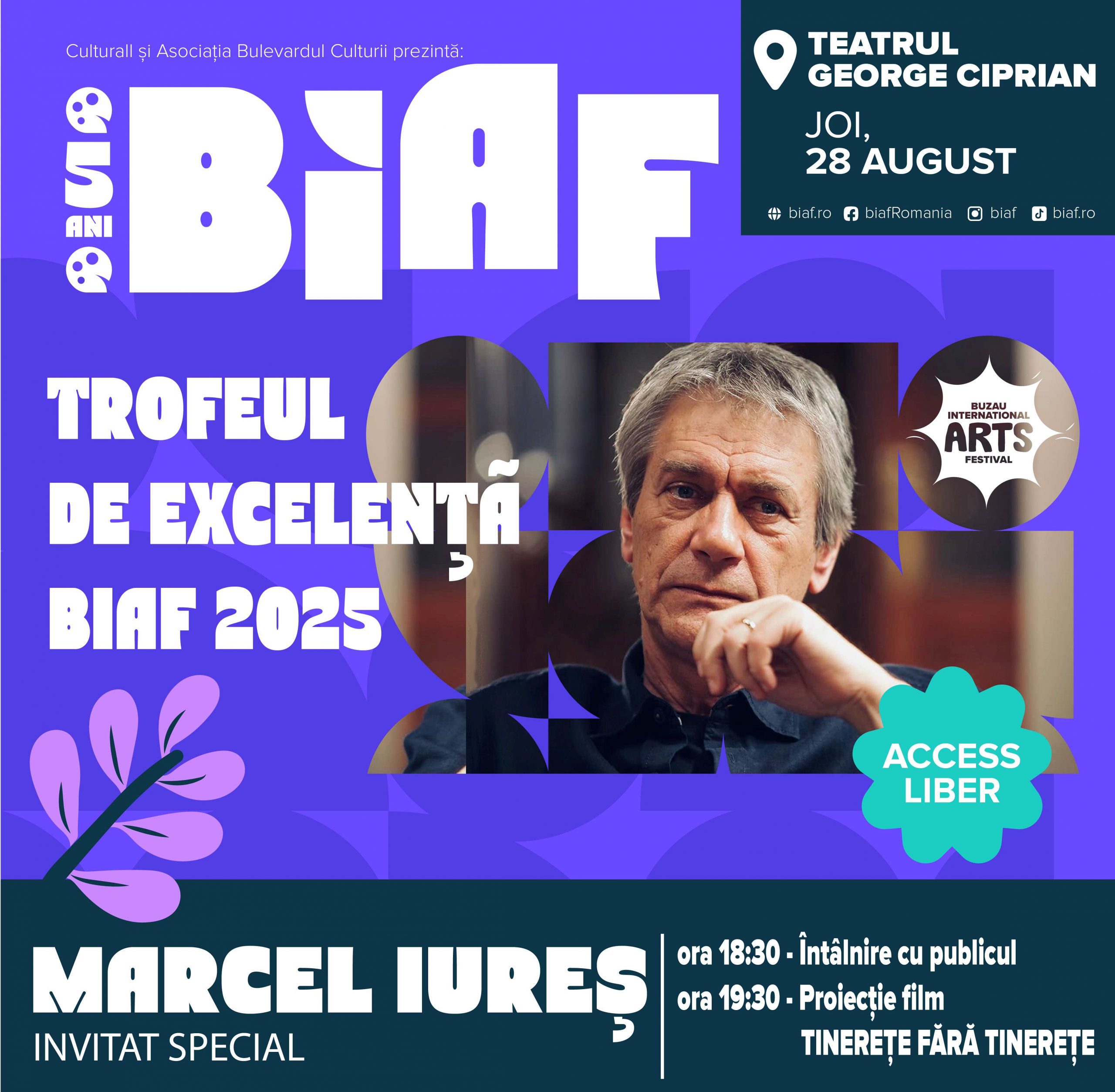 Buzău International Arts Festival (BIAF) alege, la ediția din 2025, să pună în prim-plan o personalitate care a scris istorie în teatru și film: actorul Marcel Iureș. Pe 28 august, la sala Teatrului George Ciprian, festivalul îi dedică întreaga zi artistului care a reușit să depășească granițele scenei și ecranului românești și să cucerească atât publicul autohton, cât și pe cel internațional. Momentul central al serii va fi acordarea Trofeului de Excelență BIAF, o distincție care recunoaște o carieră de peste patru decenii și o contribuție semnificativă la patrimoniul cultural al României.