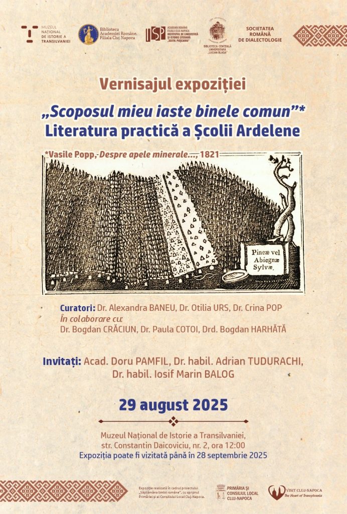 Activitățile marchează celebrarea, în 31 august, a Zilei Limbii Române, și vor debuta vineri, 29 august, de la ora 12, cu vernisarea expoziției „Scoposul mieu iaste binele comun”. Literatura practică a Școlii Ardelene (curator: Alexandra Baneu), care va avea loc la Muzeul Național de Istorie a Transilvaniei, Palatul Reduta, str. C. Daicoviciu, nr. 2.
