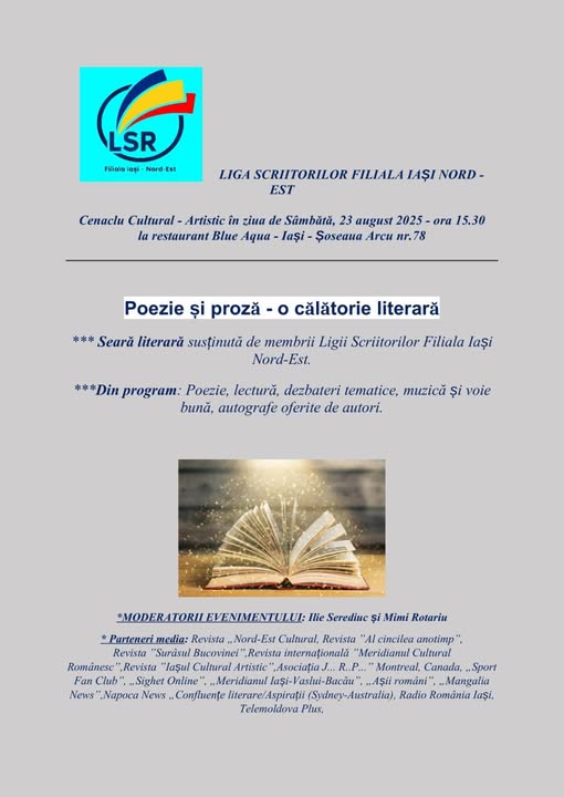 În după-amiaza zilei de 23 a lunii august, toamna își făcea prezența prin pădurile din împrejurimile capitalei Moldave, dar soarele binevoitor ne-a călăuzit pașii spre Grădina de Vară-Restaurant „Blue Aqua”. Salonul Alb al acestei locații primitoare a fost rezervat Filialei Ligii Scriitorilor Români, Iași Nord-Est, pentru desfășurarea Cenaclului Cultural-Artistic organizat în cinstea și onoarea „Zilei Limbii Române”! În deschiderea ședinței de cenaclu, președintele Ligii Scriitorilor, Filiala Iași Nord – Est, scriitorul și jurnalistul  Ilie Serediuc, a prezentat tema manifestării și a urat bun venit invitaților, mulțumind membrilor colegiului director, organizatori ai evenimentului.