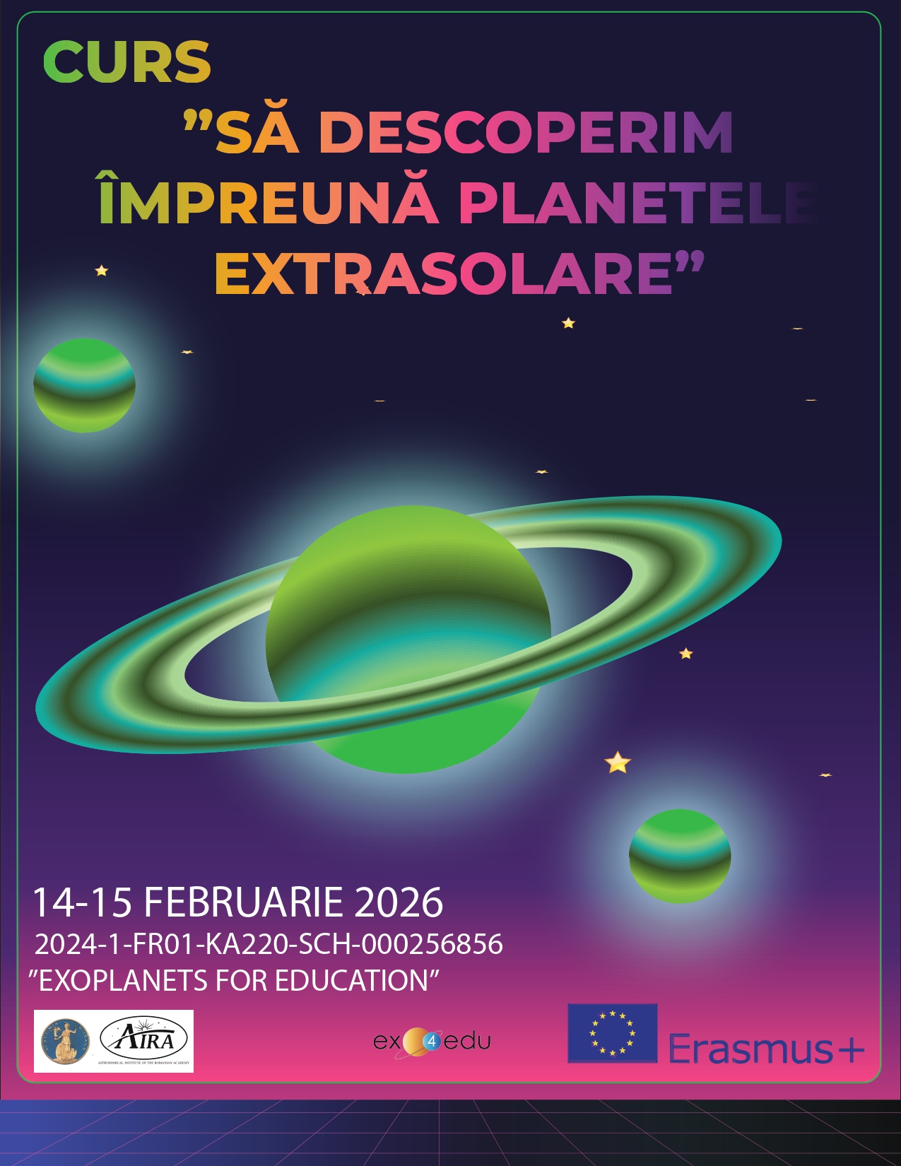 Institutul Astronomic al Academiei Române și Observatorul Astronomic al Academiei Române, Filiala Cluj-Napoca, organizează, în perioada 14-15 februarie 2026, la București și Cluj-Napoca, prima sesiune națională de formare din proiectul „Exoplanets for Education (Exo4Edu)” dedicată cadrelor didactice din învățământul preuniversitar.