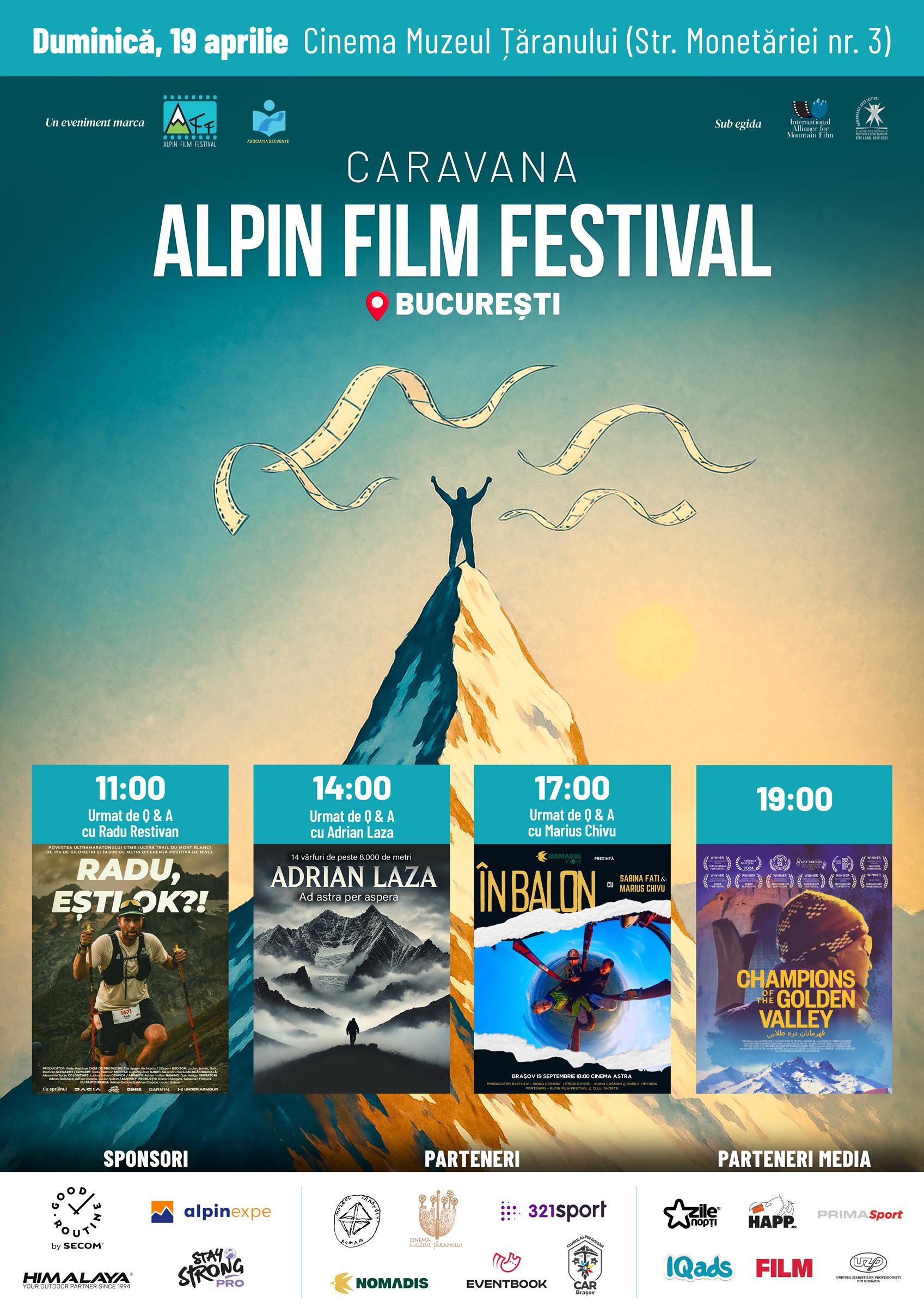 Alpin Film Festival, cel mai important festival de cultură montană din România, ajunge la București pentru prima datǎ, cu o selecție ineditǎ de filme și povești din lumea alpinismului, alergǎrii montane, şi turismului de aventurǎ: Radu, ești ok?! (regia: Lucian Șuhan, Radu Restivan), Ad Astra per Aspera (realizator: Steliana Orășanu), În balon cu Sabina Fati şi Marius Chivu (regia: Rareș H. Stoica), Champions of the Golden Valley (regia: Ben Sturgulewski).
