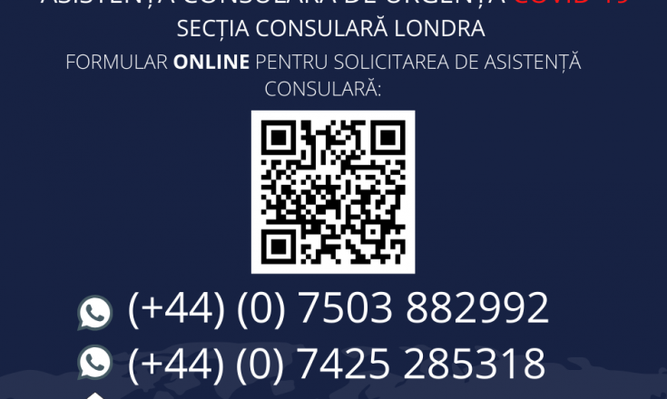 COMUNICAT Ca urmare a numeroaselor solicitari privind acordarea asistentei consulare cetatenilor romani in contextul pandemiei COVID-19, Sectia Consulara Londra pune la dispozitia cetatenilor romani aflati in situatii de urgenta un FORMULAR ONLINE, rapid si sigur de inregistrare pentru a solicita sprijinul misiunii diplomatice Londra. prin accesarea paginilor oficiale ale Misiunii noastre diplomatice: http://ambasada-romaniei.co.uk/ro/covid-19 si https://londra.mae.ro/node/2258. Formularul se adreseaza cetateniilor romani care se regasesc intr-o