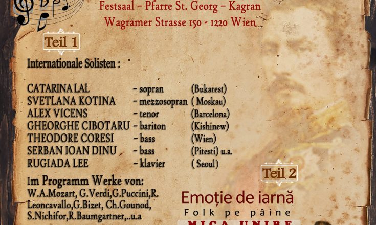 COMUNICAT COMUNICAT LA MULTI ANI 2020! – Sărbătorim împreună la VIENAOPERNSÄNGER STUDIO WIEN & RADIO TV UNIREA – au deosebita plăcere de a vă invita, să luați parte la CONCERTUL DE GALA – „FESTKONZERT”- dedicat împlinirii a 161 de ani de la UNIREA PRINCIPATELOR ROMÂNE din 1859 (MICA UNIRE) Un eveniment al comuniunii de suflet