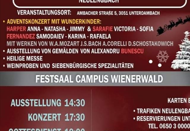 Un eveniment caritabil de strângere de fonduri pentru înființarea unui centru de integrare prin cultură! Data: 22 decembrie Locaţie: Ambacher Strasse 5, 3051 Unterdambach Sala Festivă, Campusul Wienerwald Program: expoziţie orele 14:30 concert: orele 17:30 slujbă: orele 19:00 Intrare: 15 euro, copiii sub 18 ani intrare gratuită Care este menirea acestui centru? Acest centru valorifică