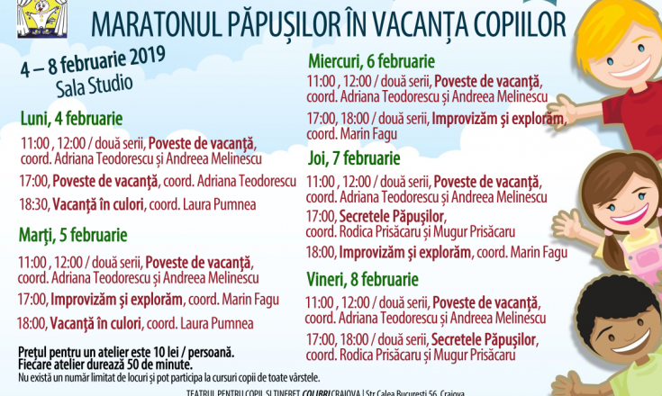 Teatrul Colibri îi așteaptă din nou pe copii să petreacă o vacanță activă și creativă, în Fabrica de povești, în perioada 4 – 8 februarie 2019, în 20 de ateliere de teatru interactiv, a câte 50 de minute fiecare, care se vor desfășura zilnic, în intervalul orar 11:00 – 19:00, în Sala Studio, prețul pentru