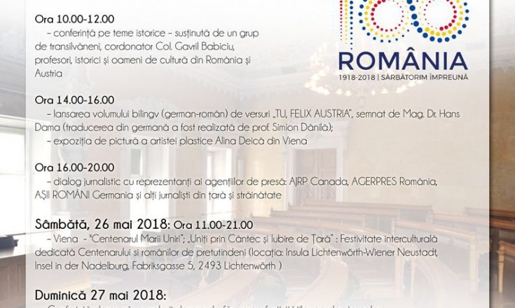 Comunicat de presa Sub numele generic – “Centenarul Marii Uniri”, vor avea loc o serie de evenimente culturale, de înaltă ținută intelectuală și deosebită anvergură, prin care se va celebra grandioasa împlinire istorică, a neamului românesc – MAREA UNIRE a ROMANILOR, desăvârșită la ALBA IULIA, în decembrie, 1918.