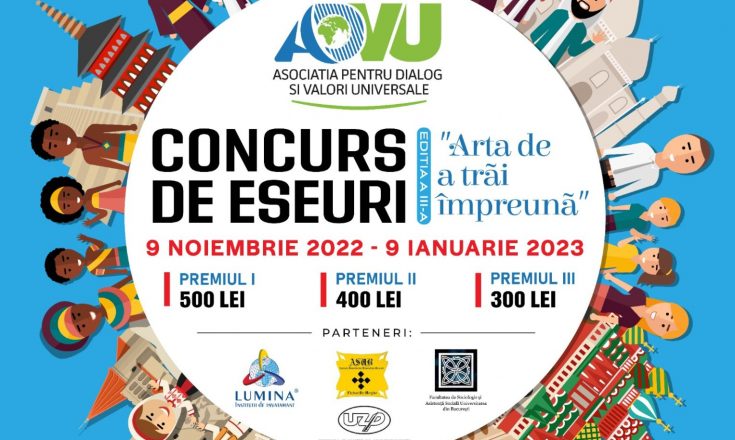 COMUNICAT Ediția a III-a a Concursului de Eseuri ,,Arta de a trăi împreună” are ca obiectiv prezentarea, prin eseuri, a frumuseții diferențelor dintre noi, diferențe care ne fac unici și ne ajută să conviețuim într-un mod armonios. Abia așteptăm să vedem noile viziuni despre ceea ce înseamnă ,,Arta de a trăi împreună”! Perioada de desfășurare
