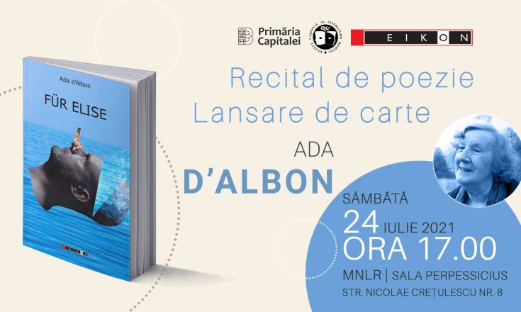 Muzeul Național al Literaturii Române găzduiește sâmbătă, 24 iulie 2021, de la ora 17.00, un recital de poezie, dar și lansarea de carte a Adei d’Albon, „Für Elise”, apărută la Editura Eikon, în Sala Perpessicius din Str. Nicolae Crețulescu nr. 8. Participă: Christian Crăciun, Valentin Ajder, Vianu Mureșan.Actrița Ada d’Albon a părăsit România în 1981