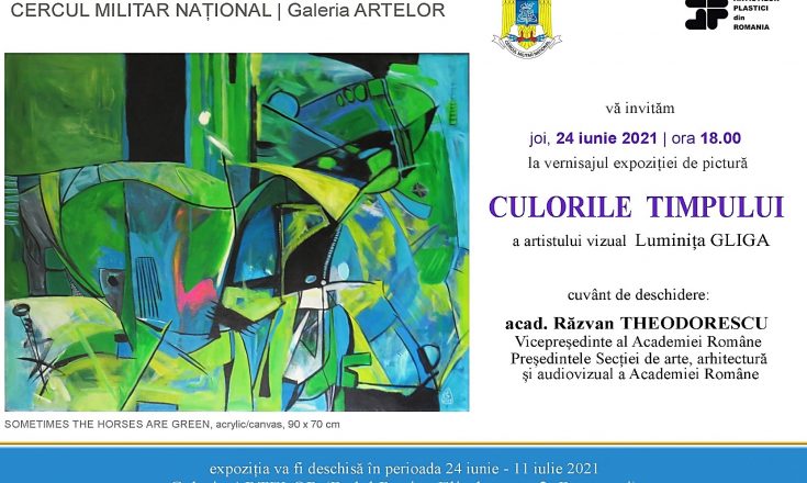 COMUNICAT Luminița GLIGA CULORILE TIMPULUI | Galeria ARTELOR, Cercul Militar Național – expoziție de pictură – 24 iunie – 11 iulie 2021 Expoziția CULORILE TIMPULUI a artistului vizual Luminița GLIGA, va avea vernisajul joi, 24 iunie 2021, ora 18.00 la Galeria Artelor, Cercul Militar Național din București. Prin acest eveniment se redeschide programul expozițional al