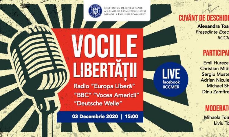 COMUNICAT Joi, 3 decembrie 2020, începând cu ora 15:00, va avea loc conferința online Vocile libertății: Radio „Europa Liberă”, „BBC”, „Vocea Americii”, „Deutsche Welle”, organizată de Institutul de Investigare a Crimelor Comunismului şi Memoria Exilului Românesc (IICCMER). Evenimentul va fi transmis live pe pagina de facebook a IICCMER. Conferința are scopul să (re)aducă în discuție importanța posturilor de