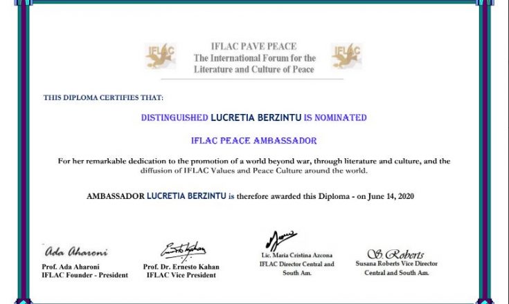 În urmă cu peste 20 de ani, în Haifa, Israel, Prof. Ada Aharoni a pus bazele unei organizații internaționale care să promoveze pacea prin intermediul culturii și literaturii – IFLAC, adică Forumul Internațional pentru Literatură și o Cultură a Păcii. Pe data de 14 iunie a.c. jurnalista şi scriitoarea româncă Lucreţia Berzintu a primit recunoaşterea